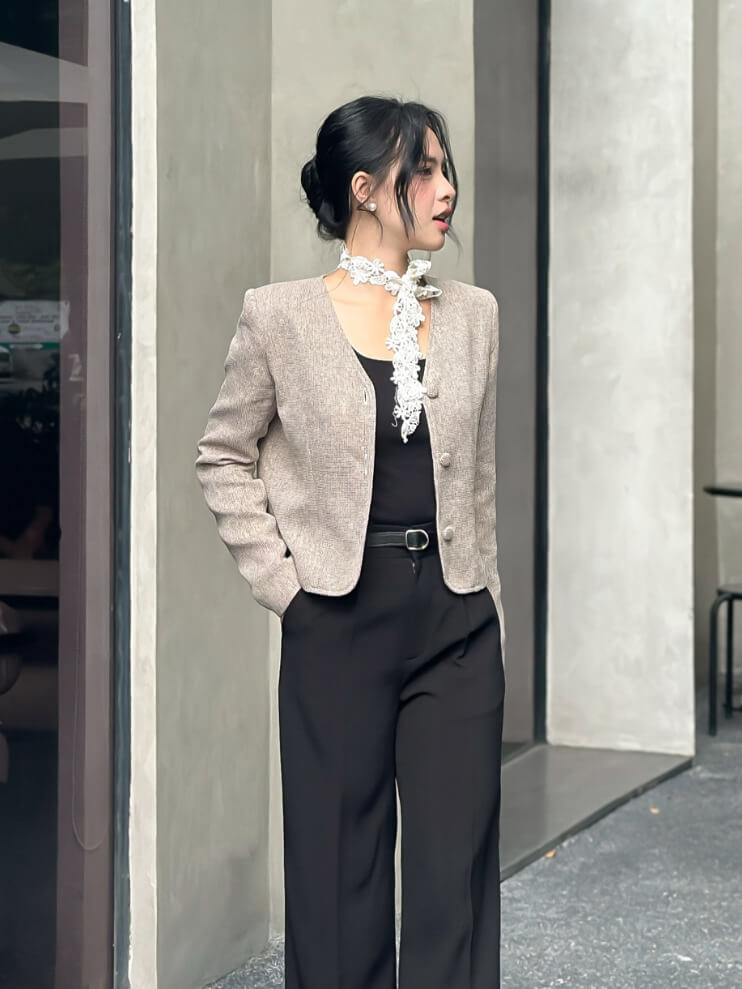 Chiếc áo khoác nút tàu nổi bật với dáng form vuông vức, ôm nhẹ cơ thể giúp giữ được vẻ thanh lịch mà không hề cứng nhắc. Kiểu cổ tròn mềm mại kết hợp chi tiết nút tàu cổ điển tạo điểm nhấn nhẹ nhàng, giúp khuôn mặt thêm sáng và dịu dàng hơn.