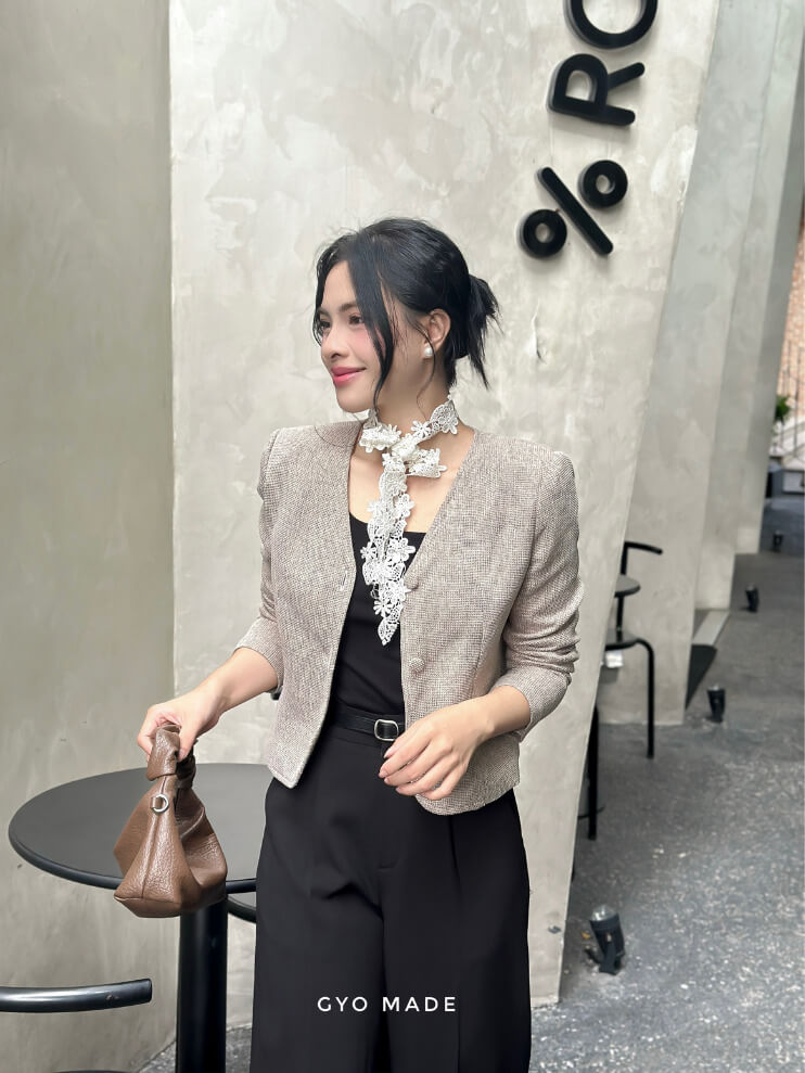 Phần mút đệm vai được may vừa phải, giúp tôn dáng vai thẳng và tạo form áo chuẩn chỉnh. Đường may tinh xảo thể hiện rõ sự đầu tư của Gyo Made trong từng chi tiết. Mẫu áo này phù hợp cho cả đi làm, đi dự tiệc hay gặp gỡ bạn bè.