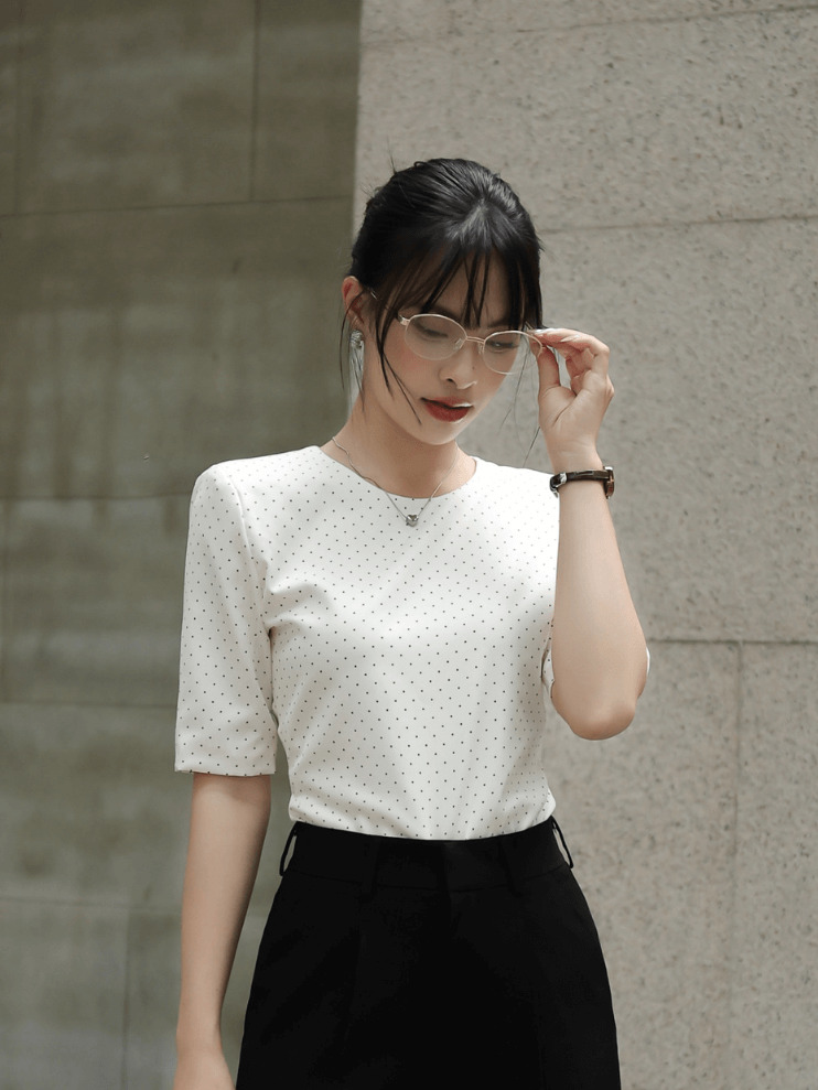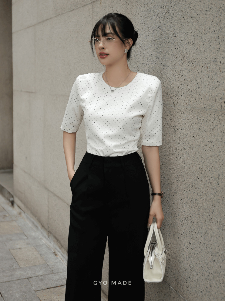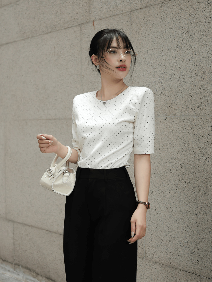 Áo kiểu chấm bi nữ dễ kết hợp với quần tây, chân váy bút chì hoặc quần jean cạp cao. Khi phối cùng blazer, outfit trở nên chuyên nghiệp và sang trọng.