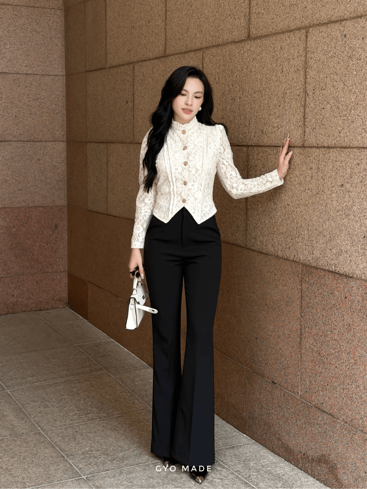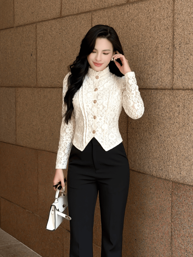 Áo ren nữ dễ phối cùng quần tây hoặc chân váy. Khi kết hợp giày cao gót, outfit trở nên thanh lịch.